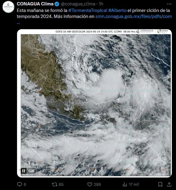 A las 09:00 horas, tiempo del centro de México, se formó la tormenta tropical “Alberto”, el primer ciclón tropical de la temporada 2024. Su centro se localizó a 250 kilómetros (km) al este-noroeste de Cabo Rojo, Veracruz, y a 300 km al este de Tampico, Tamaulipas, con vientos máximos sostenidos de 65 kilómetros por hora (km/h), rachas de 85 km/h y desplazamiento hacia el oeste, a 15 km/h.