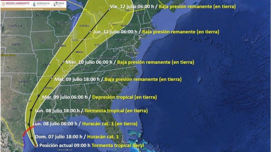 Beryl ocasionará lluvias puntuales muy fuertes en Tamaulipas, asi como chubascos en Coahuila y Nuevo León; además, se prevén rachas fuertes de viento de 60 a 80 km/h, oleaje elevado de 1 a 3 metros de altura y probabilidades de trombas marinas en la costa norte de Tamaulipas.