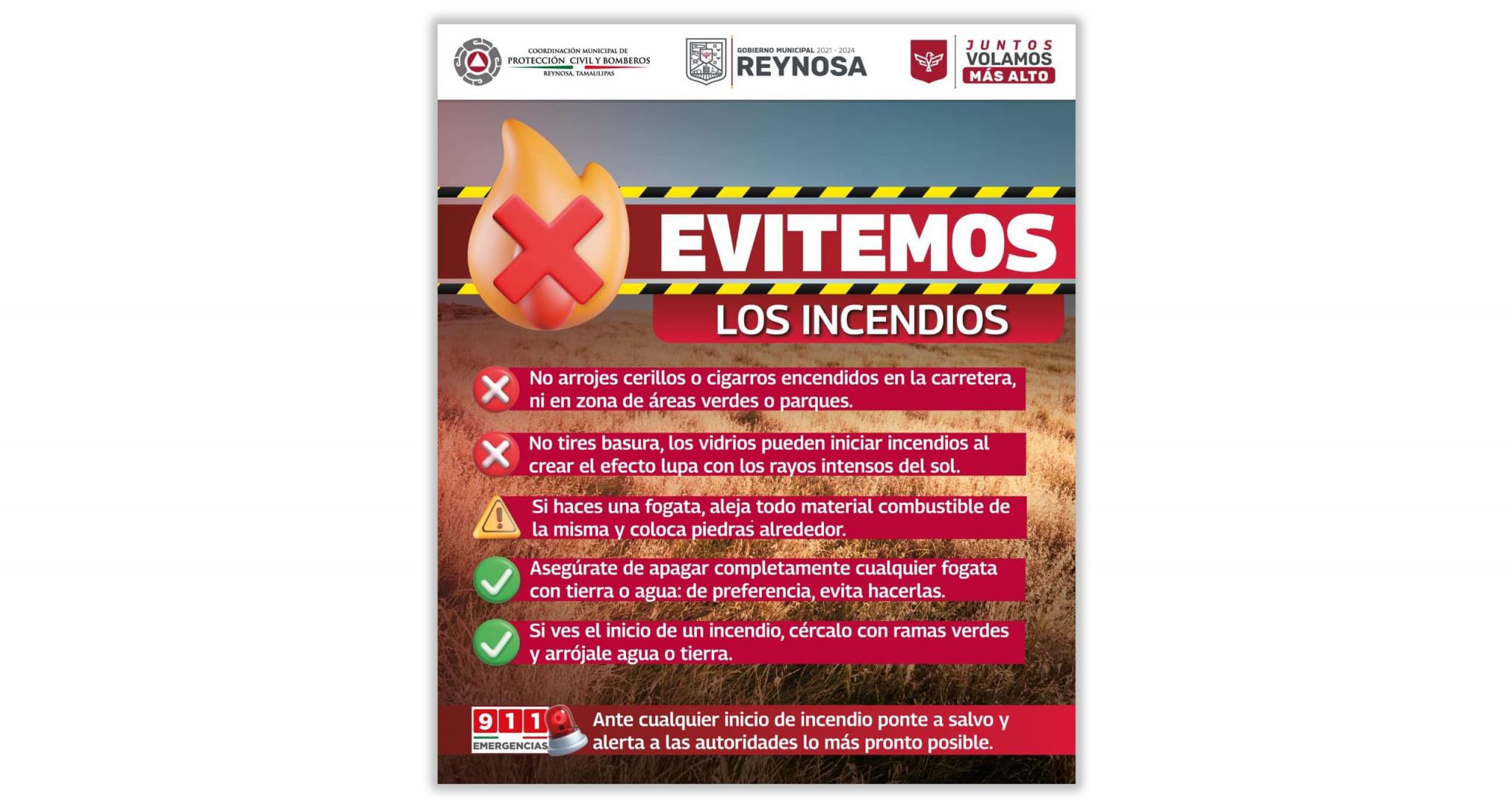 El Gobierno de Reynosa, que preside Carlos Peña Ortiz, te invita a actuar con responsabilidad evitando la quema de basura en tu patio, predios baldíos o en la via pública, para prevenir incendios que en muchos casos provocan daños considerables y eventualmente pérdidas humanas.