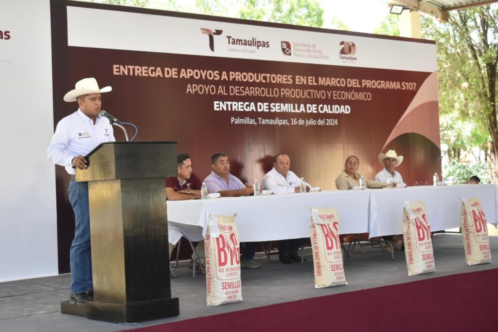 Palmillas, Tamaulipas.- Con la firme intención de continuar apoyando a los productores del estado con programas y recursos que contribuyan al desarrollo sostenible del sector agropecuario, el Gobierno del Estado realizó la entrega de 2.72 toneladas de Semilla de Calidad de Maíz a productores rurales del municipio de Palmillas.