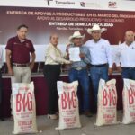 “Con la entrega de semilla de calidad de la variedad “Llera III”, que se otorgó en la cabecera municipal de Palmillas, se garantiza el abasto oportuno de alimentos a los sectores más necesitados, apoyando al sector campesino y así elevar su productividad y la autosuficiencia en alimentos básicos”, refirió.