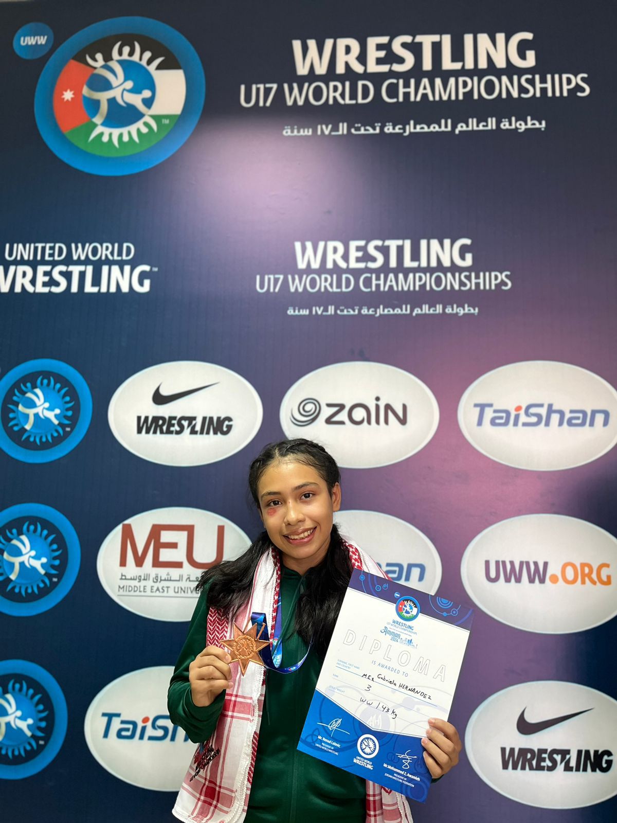 Ciudad Victoria, Tamaulipas.-Gabriela Palacios Hern谩ndez, oriunda de Matamoros, Tamaulipas, logr贸 una hist贸rica medalla de bronce en la Copa del Mundo Sub-17 de Luchas Asociadas, celebrada en Jordania.