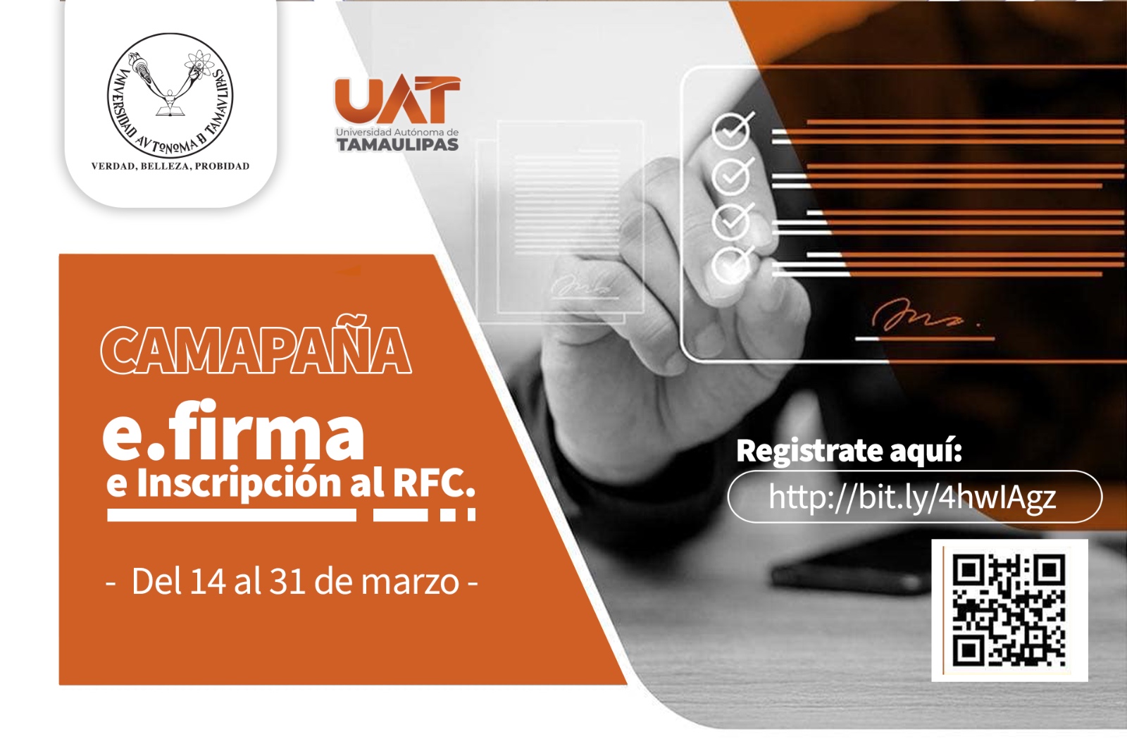 La Facultad de Comercio y Administración Victoria (FCAV) de la Universidad Autónoma de Tamaulipas (UAT) ofrece a la comunidad universitaria y al público en general su campaña para obtener la e.Firma y la inscripción Registro Federal de Contribuyentes (RFC).