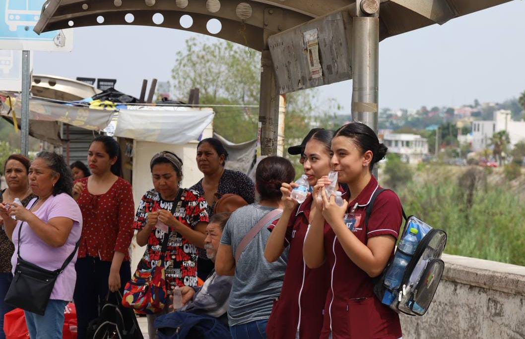 Paramédicos y personal de bomberos recorrieron del 6 al 8 boulevard Praxedis Balboa para ofrecer raciones de agua fresca a niños, jóvenes y adultos para evitar afectación en su salud por los 41 grados centígrados, con sensación térmica de 43, que registran en la Capital del Estado.