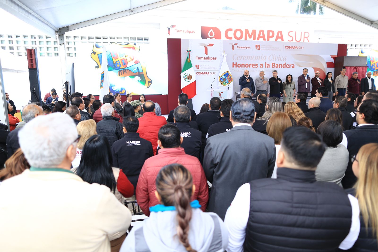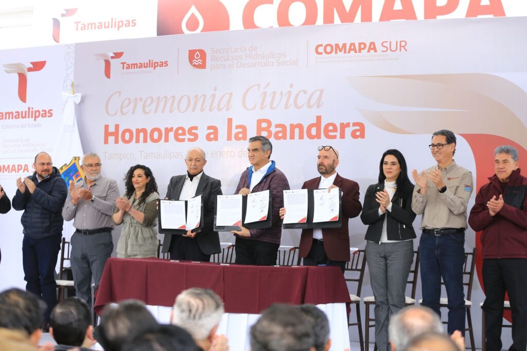 Fue en el marco de la ceremonia cívica de honores celebrada este martes en las instalaciones de la Comapa Sur, donde el gobernador también develó una placa y recibió un reconocimiento del Consejo Ciudadano de Colonos de Tampico, Madero y Altamira por su liderazgo para afrontar y superar la crisis hídrica que se vivió en esta región el año pasado.