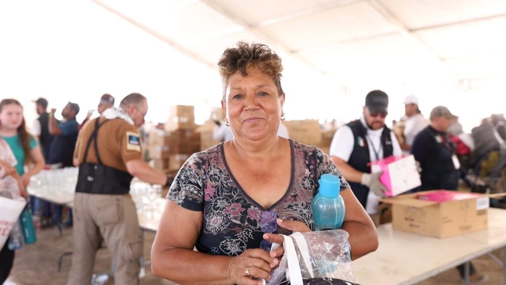 Por medio de camiones de carga del Ejército Mexicano, junto a sus elementos y personal de dependencias del Gobierno Federal y Estatal, fueron puestos a disposición de los asistentes más de 23 mil 342 productos diversos como útiles escolares, materiales de limpieza, enseres domésticos, así como prendas de vestir y calzado para toda la familia.