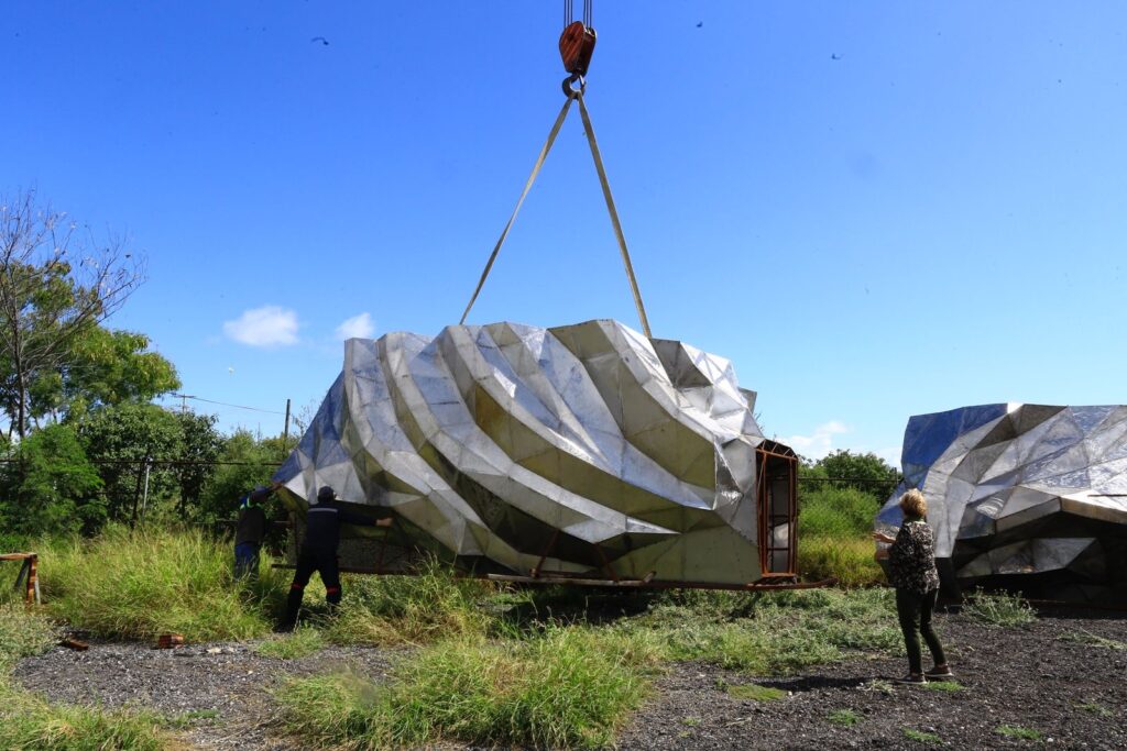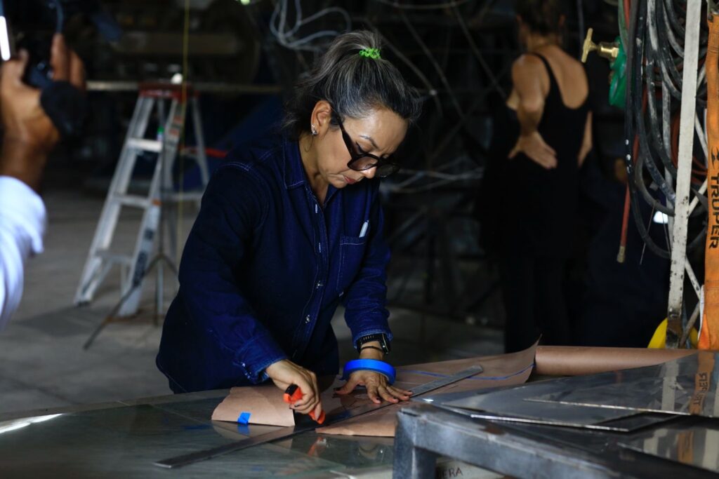 Por su parte, la directora del proyecto, María Fernanda Saiz, explica los detalles técnicos de la obra monumental; “no hay una sola pieza igual, toda está hecha a mano, cada una de ellas es distinta, algunas llevan dobleces, otras no”.