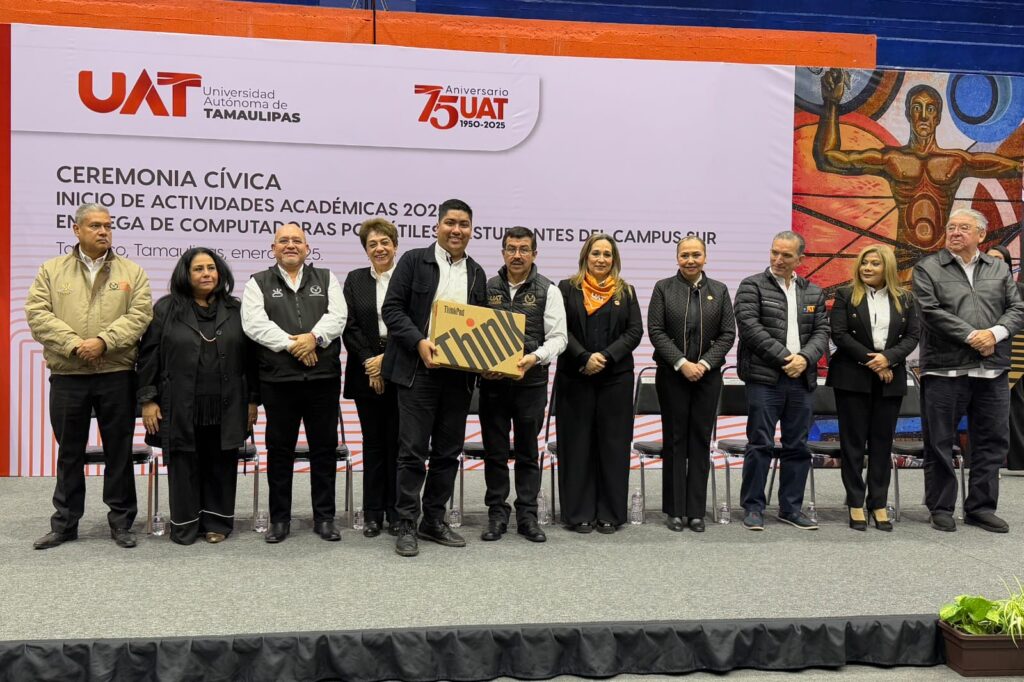 De manera simbólica, durante esta ceremonia se entregaron 907 computadoras a estudiantes. Esto con el apoyo del gobernador Américo Villarreal, con el que se da continuidad a este programa sin precedentes, el cual refleja la visión de una Universidad inclusiva y centrada en las necesidades de su sociedad.