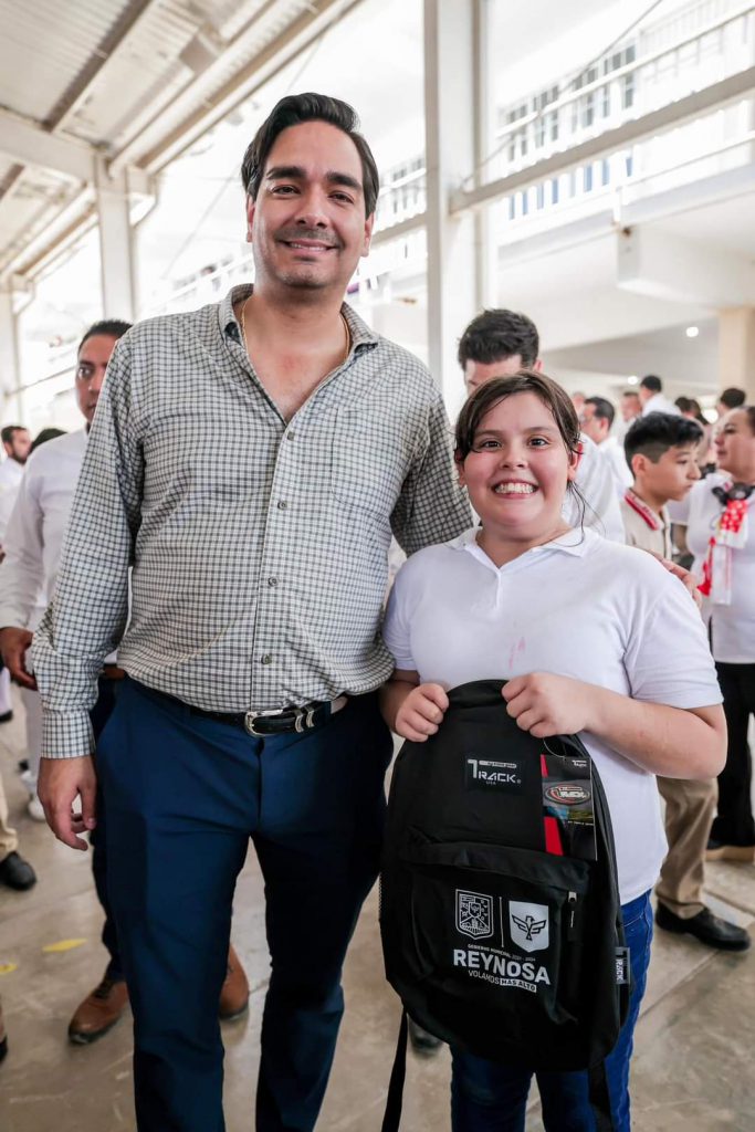 “Hoy tenemos muchos sueños, ¿cuántos quieren ser doctores, ingenieros, abogados? Para todo, lo fundamental es educarse, por eso los invito a que todos los días aprendan algo nuevo, para que puedan ustedes aportar su granito de arena para que Reynosa, Tamaulipas y México estén mejor”, dijo el Alcalde al refrendar su compromiso con la educación.