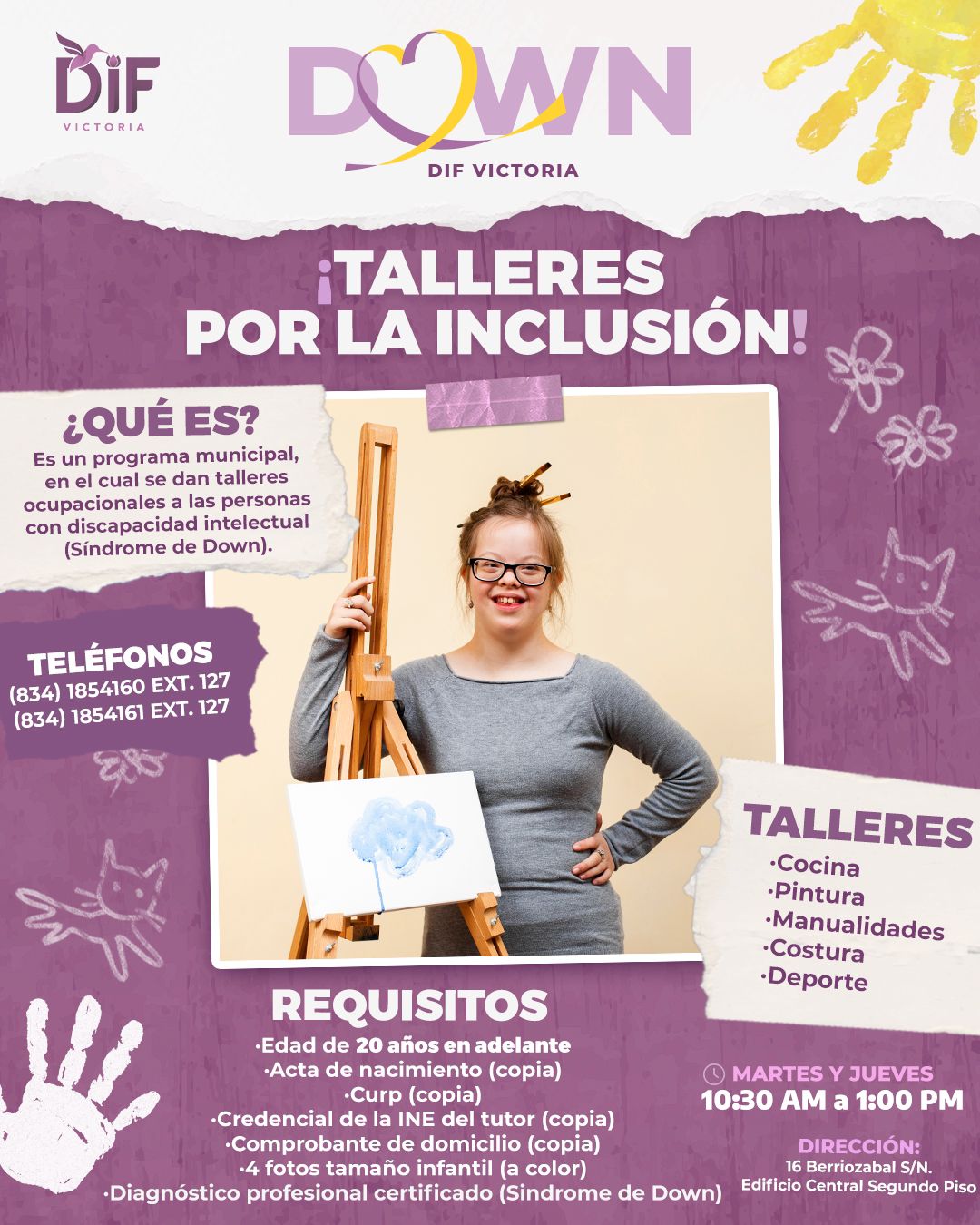 De la misma forma, para adultos de 20 años en adelante con Síndrome de Down, se han implementado los “Talleres por la Inclusión”, mediante los cuales impartirán los martes yjueves de 10:00 am a 1:00 pm talleres ocupacionales tales como cocina, pintura,manualidades, costura, deporte, entre otros, con el fin de brindar una nueva oportunidad de aprendizaje.