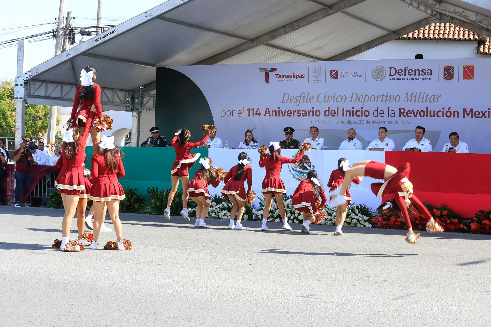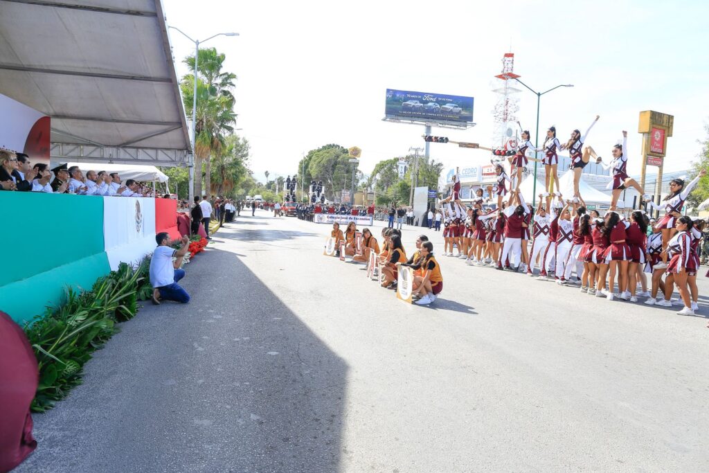 Acompañado por el general DEM Enrique García Jaramillo, comandante de la 48ª Zona Militar, el gobernador Américo Villarreal atestiguó, por espacio de casi cuatro horas, el paso de los contingentes llenos de colorido, música tradicional mexicana y atuendos revolucionarios, todos ejecutando sus rutinas, tablas gimnásticas, pirámides monumentales y evoluciones ante el aplauso de los miles de familias congregadas a lo largo del bulevar Tamaulipas, de esta capital.
