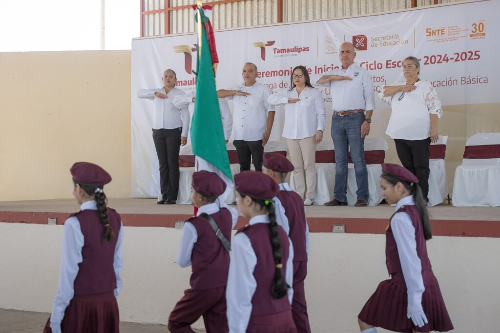 Tras realizar los honores de ordenanza, mismos que contaron con la participación de la Escolta Oficial y Banda de Guerra de la Guardia Estatal, el titular de la Secretaría de Seguridad Pública de Tamaulipas (SSPT) realizó la entrega de 307 paquetes de libros de texto gratuitos, útiles y uniformes escolares proporcionados por el Gobierno del Estado al alumnado de este plantel.