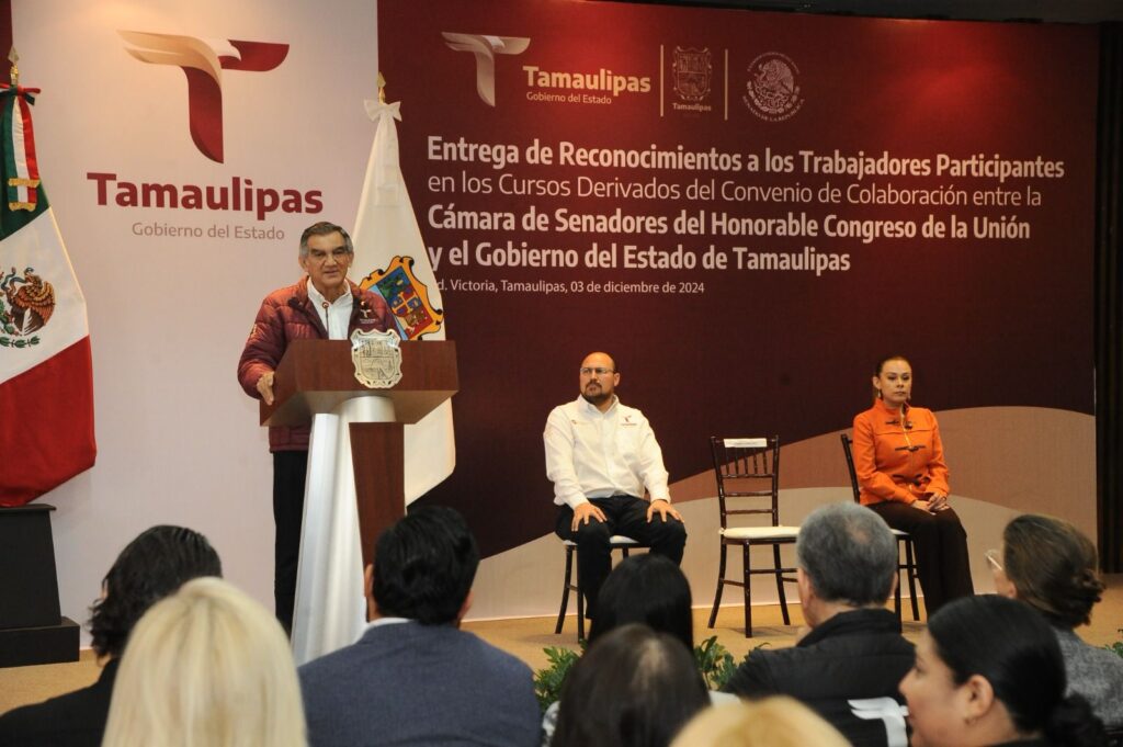 Ciudad Victoria, Tamaulipas.- Al señalar que es prioridad para su gobierno que las y los servidores públicos se capaciten de manera continua, el gobernador de Tamaulipas, Américo Villarreal Anaya, hizo entrega de 59 reconocimientos a personal de diferentes secretarías que concluyeron cursos de capacitación derivados del Convenio de Colaboración entre la Cámara de Senadores del Congreso de la Unión y el Gobierno de Tamaulipas.