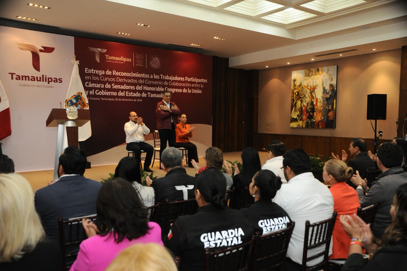 Ciudad Victoria, Tamaulipas.- Al señalar que es prioridad para su gobierno que las y los servidores públicos se capaciten de manera continua, el gobernador de Tamaulipas, Américo Villarreal Anaya, hizo entrega de 59 reconocimientos a personal de diferentes secretarías que concluyeron cursos de capacitación derivados del Convenio de Colaboración entre la Cámara de Senadores del Congreso de la Unión y el Gobierno de Tamaulipas.