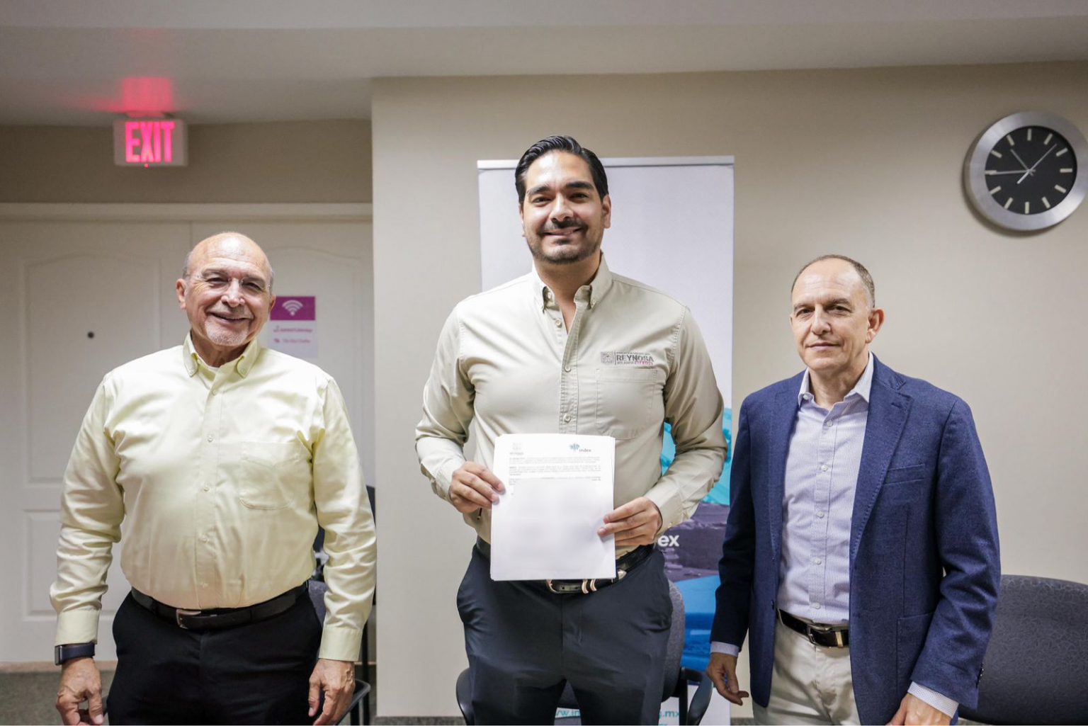 El Alcalde Carlos Peña Ortiz, firmó con el presidente de Reynosa Asociación de Maquiladoras y Manufactureras, INDEX, Ingeniero Raúl Setién Castillo, un Convenio que apoya al sector con un acceso directo a participar en la Junta Municipal de Catastro y en la actualización de sus valores.
