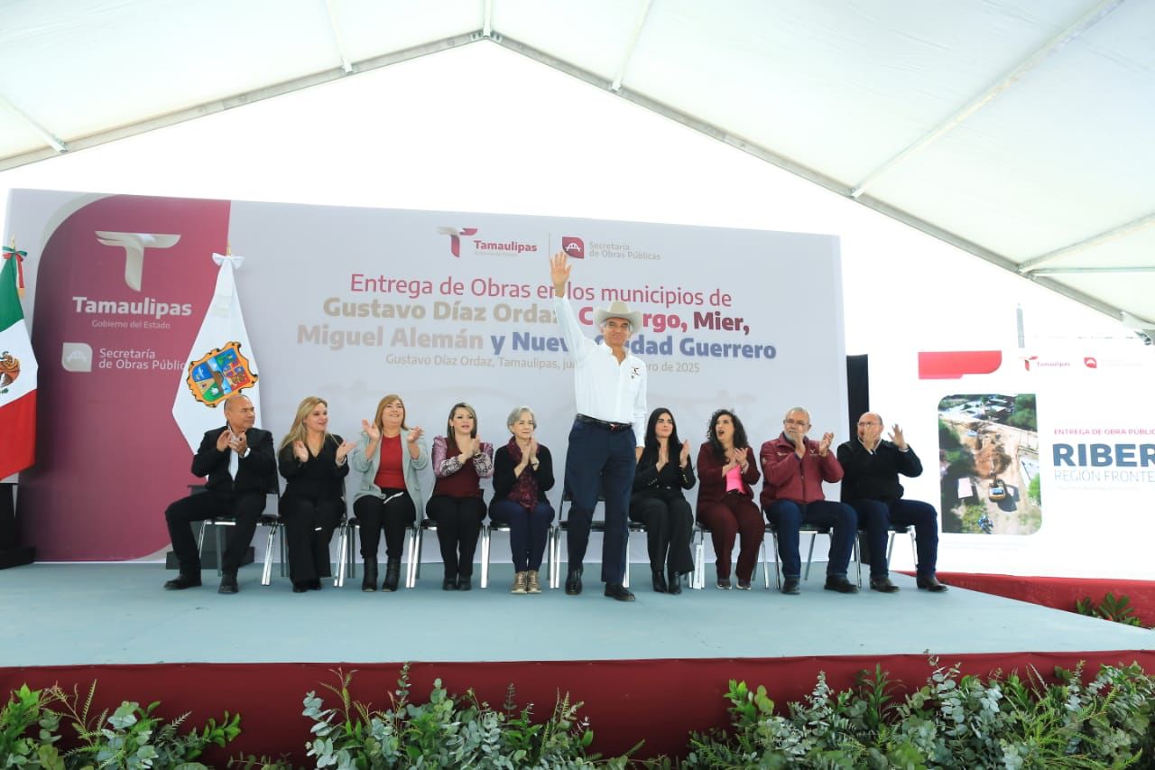 Gustavo Díaz Ordaz, Tamaulipas.– El gobernador Américo Villarreal Anaya constató la inversión por más de 243.6 millones de pesos que, desde el inicio de su administración, se ha destinado a obra pública en los cinco municipios de la zona ribereña, a la cual, se refirió como la «Frontera Grande» de Tamaulipas, luego de un planteamiento que hiciera la alcaldesa Nataly García Díaz.