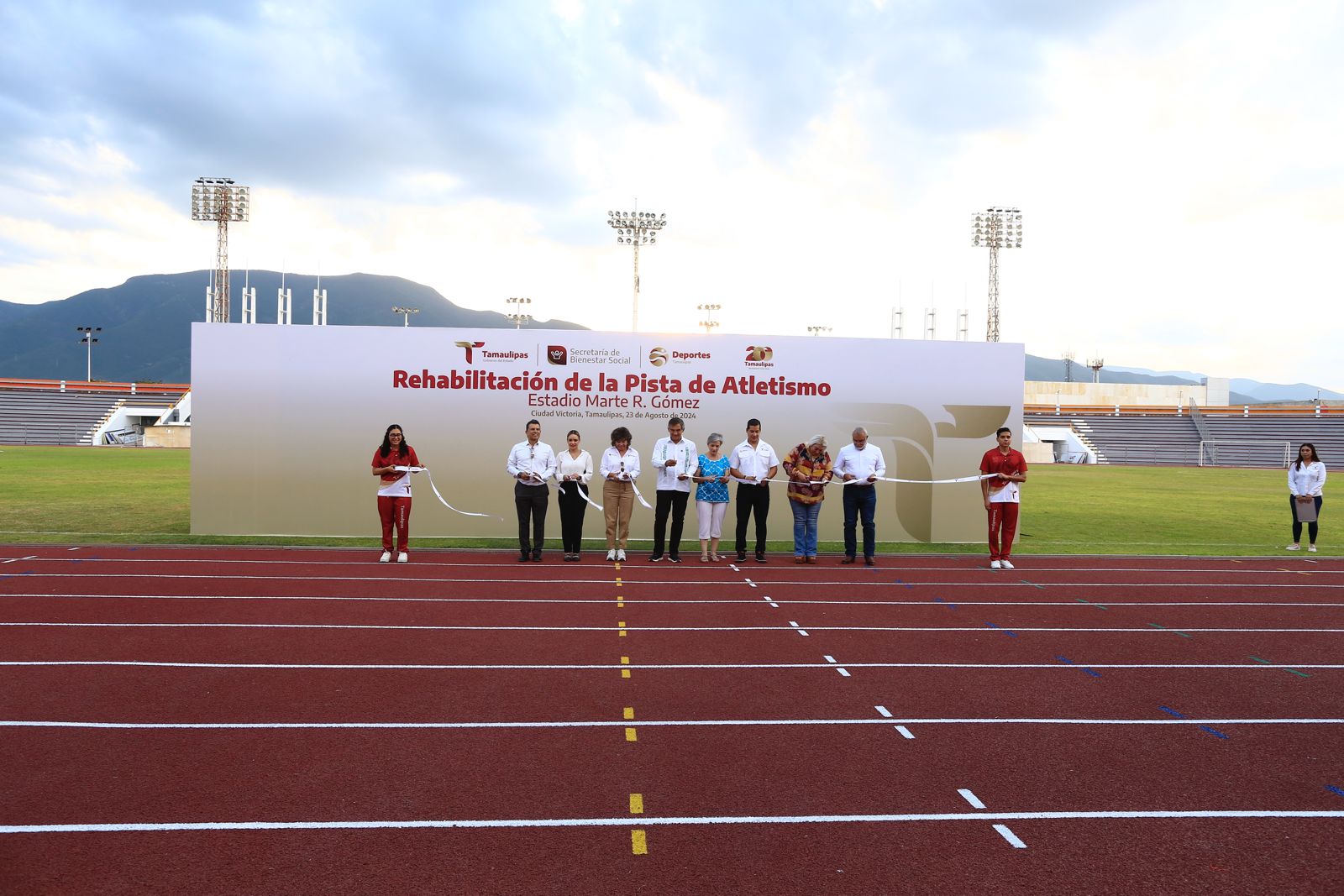 Enseguida, el gobernador y su esposa se encaminaron al estadio Marte R. Gómez, donde cortaron el listón para la reinauguración de la pista de tartán, que requirió de una inversión de 17.3 millones de pesos, y presenciaron una exhibición de 100 metros planos, carrera que estuvo a cargo de seleccionados estatales, tanto del deporte convencional como de deporte adaptado, correspondiendo al entrenador y juez nacional de atletismo, Humberto Del Toro, marcar el disparo de salida.