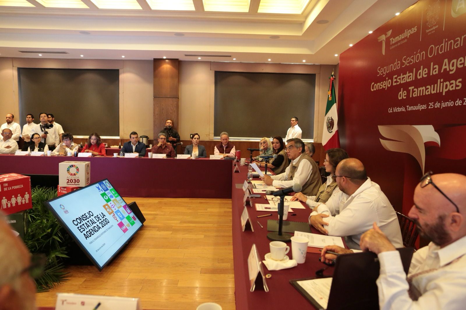 Al presidir, junto a la presidenta del Sistema DIF Tamaulipas, la doctora María de Villarreal, y la representante del Secretariado Ejecutivo del Consejo Nacional de la Agenda 2030 en México, Ana María Montaño, la segunda Sesión Ordinaria del Consejo Estatal de la Agenda 2030 para el Desarrollo Sostenible de Tamaulipas en el Salón Independencia de Palacio de Gobierno, el mandatario destacó que, independientemente de posturas políticas o credos, la pertinencia de la Agenda 2030 no debería ser objeto de controversias.