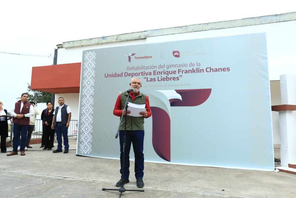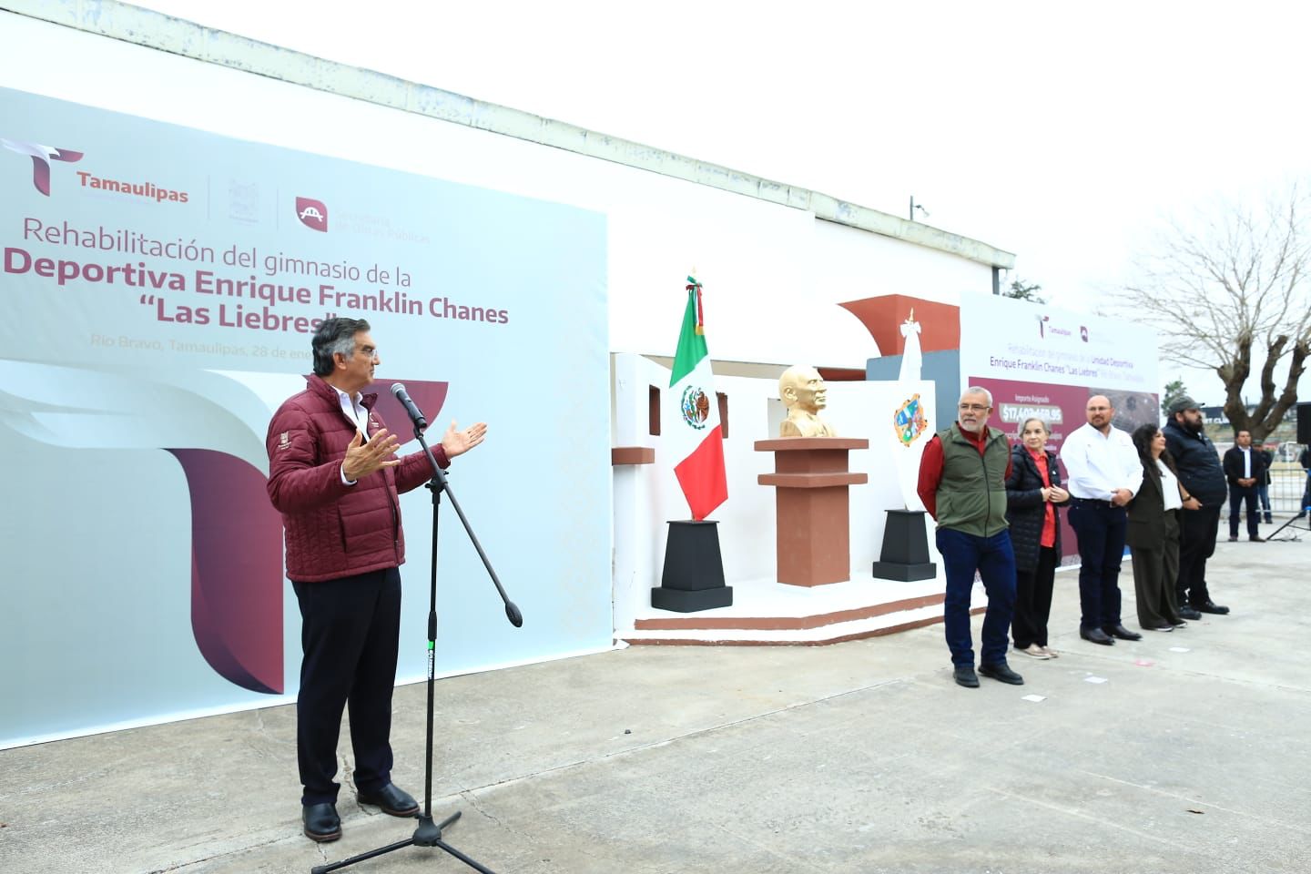 Río Bravo, Tamaulipas.- Con una inversión de más de 17 millones de pesos y en respuesta a una petición de la comunidad deportista de Río Bravo, el gobernador Américo Villarreal Anaya entregó esta tarde la obra de rehabilitación del gimnasio de la Unidad Deportiva Enrique Franklin Chanes «Las Liebres». Junto a la doctora María de Villarreal, presidenta del Sistema DIF Tamaulipas, el gobernador aseguró que la entrega de esta obra es un ejemplo del trabajo que realiza el Gobierno del Estado para recuperar la infraestructura deportiva que estuvo abandonada por otras administraciones.