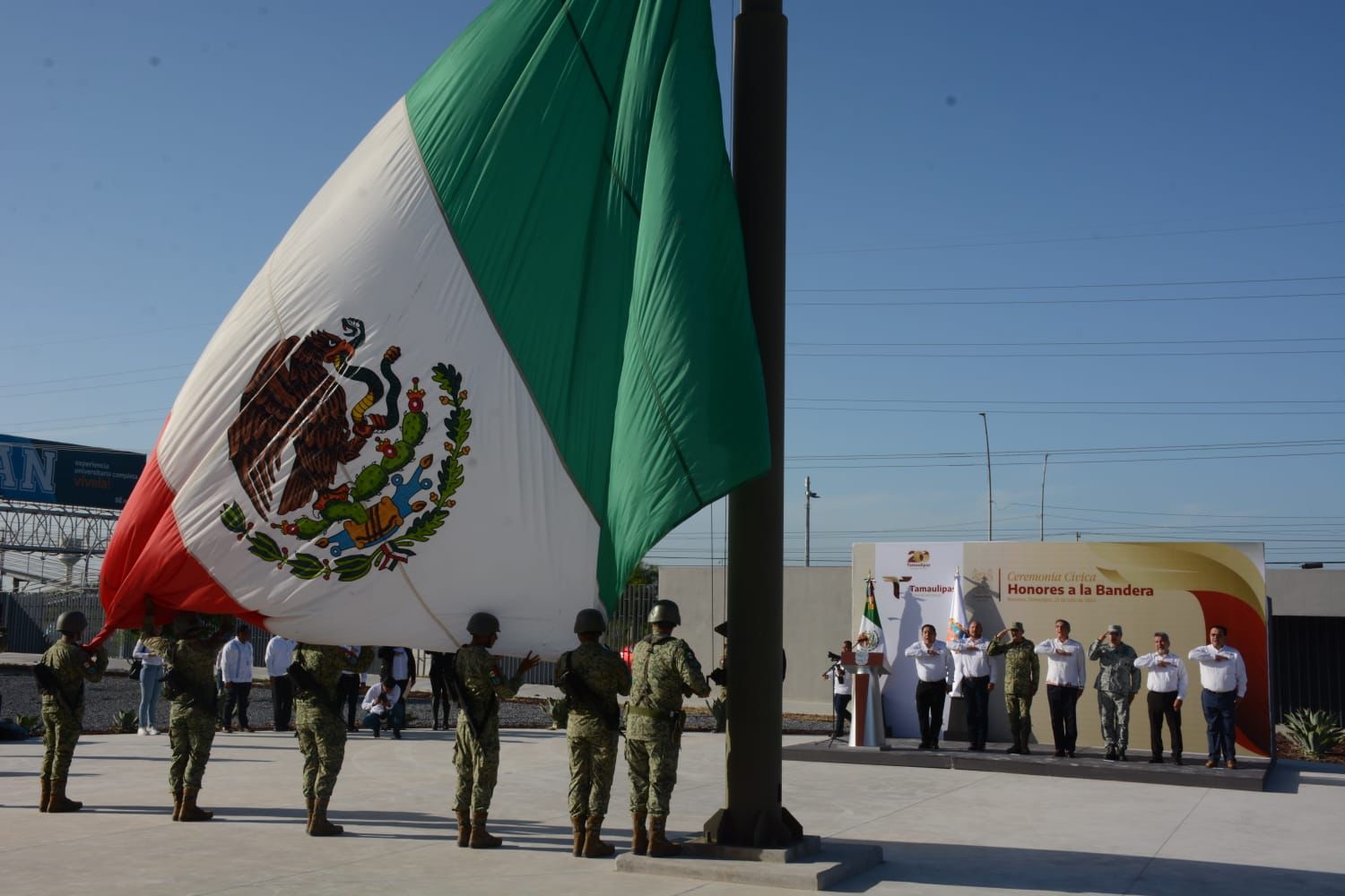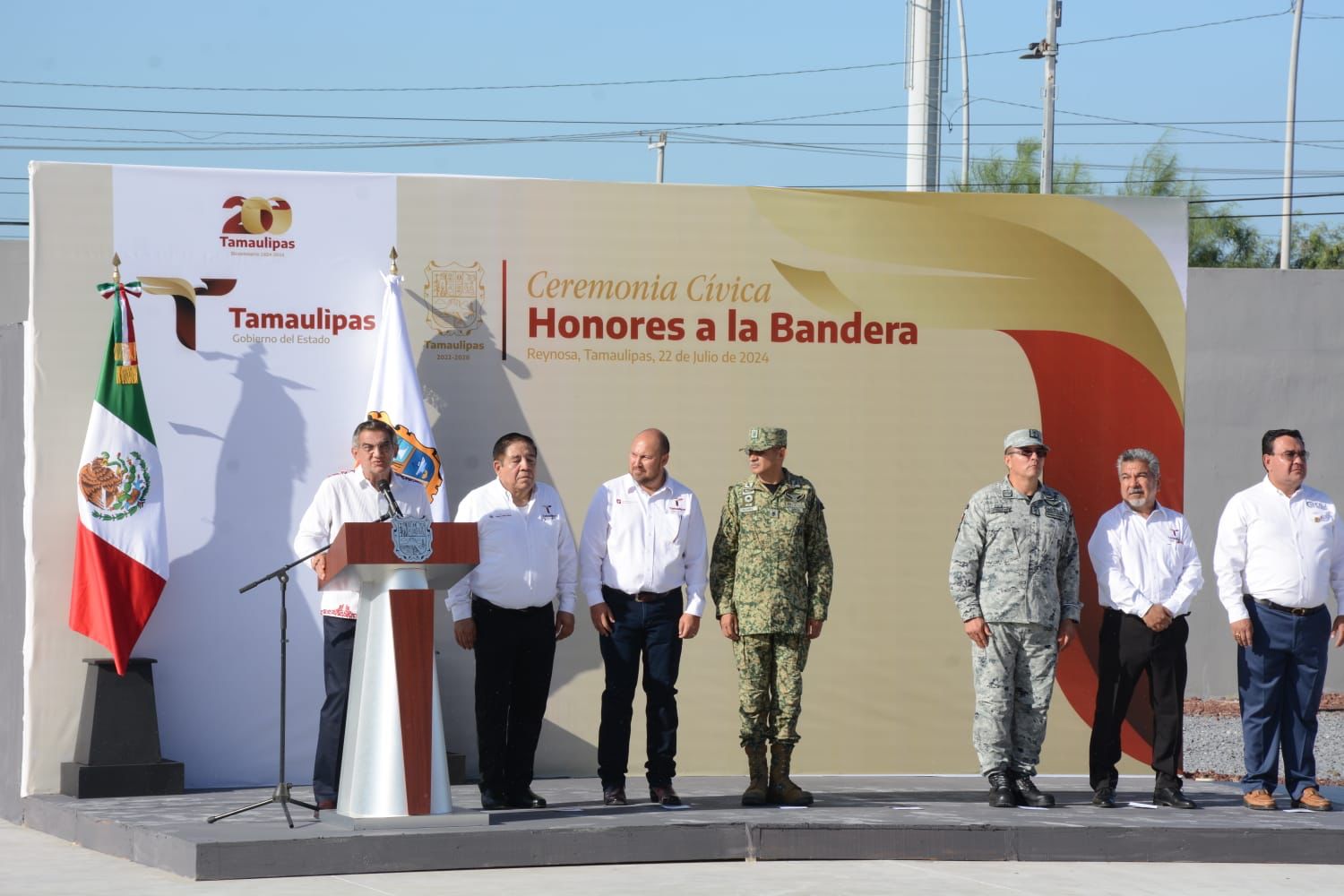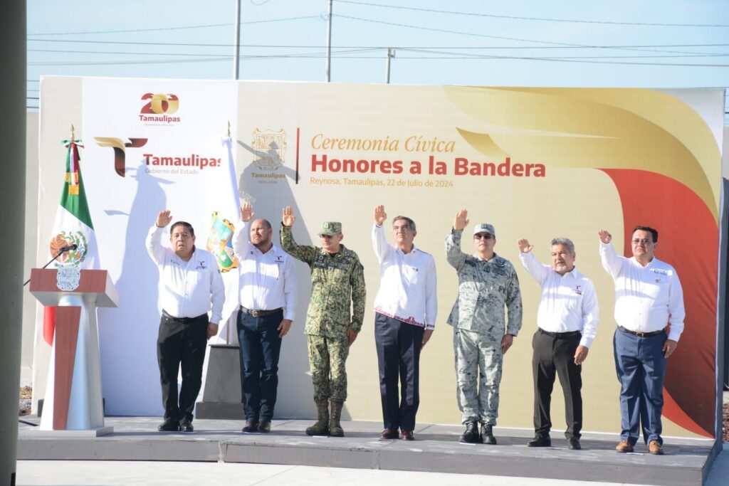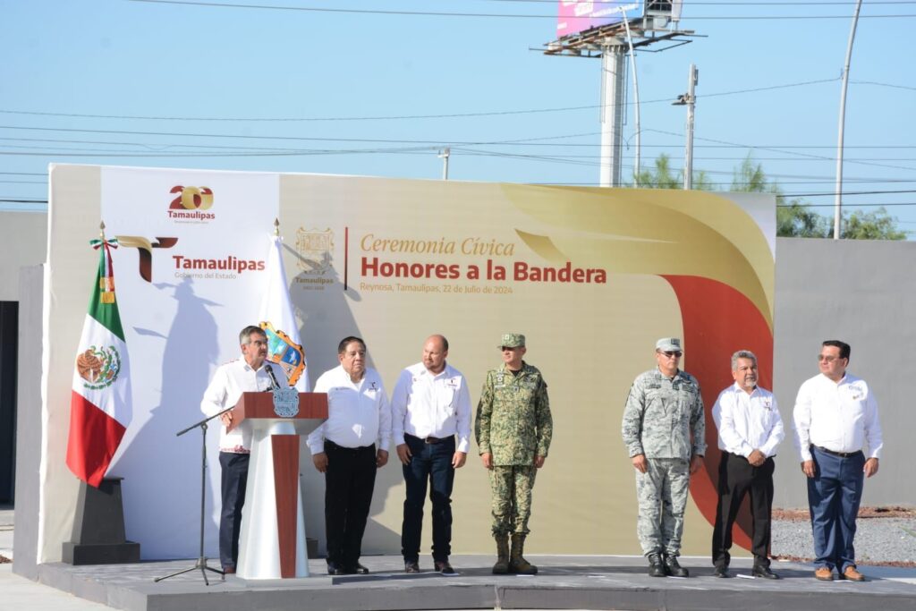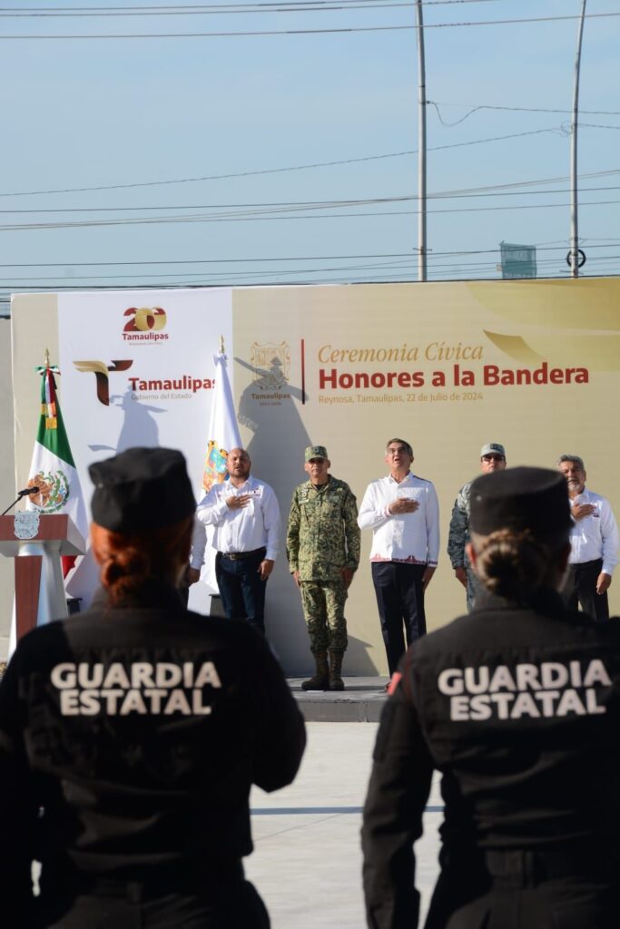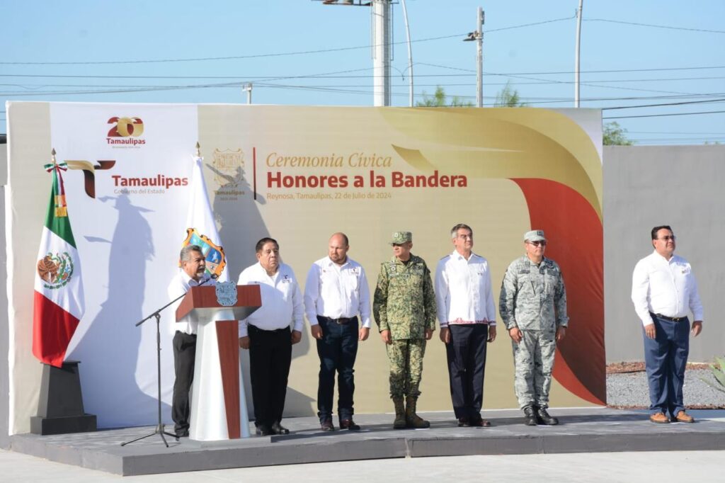 En esta ceremonia cívica, la bienvenida estuvo a cargo de Jorge Cuéllar Montoya, secretario ejecutivo del Sistema Estatal de Seguridad Pública, quien en su mensaje se refirió a los logros alcanzados en la administración de Américo Villarreal, ubicando a Tamaulipas como el noveno estado más seguro del país y el primero de las entidades en la frontera con Estados Unidos.